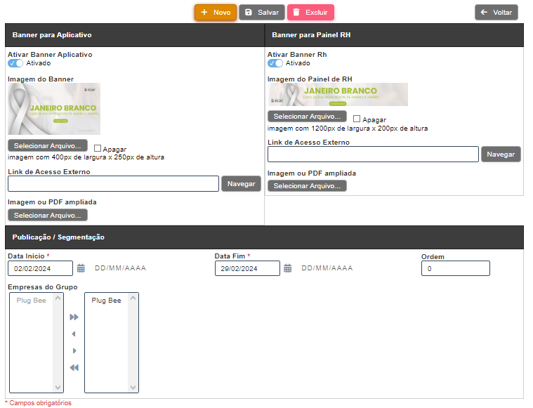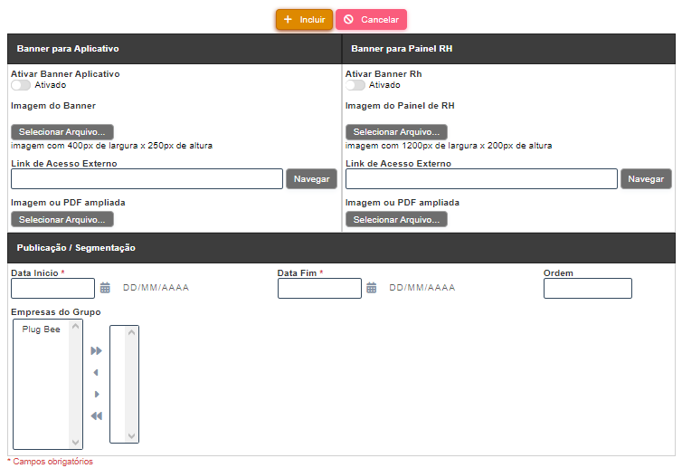, a tela acima aparecerá para o usuário. Os dois primeiros blocos do formulário, localizados na primeira linha, são responsáveis pelas informações de exibição e conteúdo dos banners (sendo a liberação para o aplicativo e para o painel de RH respectivamente). Esses blocos possuem os seguintes campos: