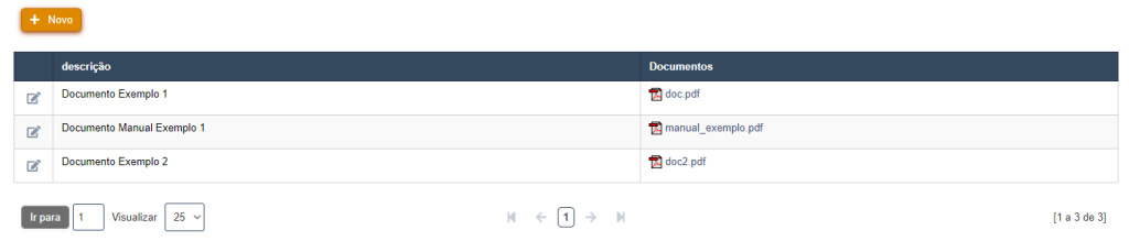 A tela para edição das informações do documento permite todos os campos serem alterados, com a diferença dos novos botões: Salvar, Excluir, Novo Documento (para gerar um formulário vazio) e Voltar (para voltar a tela anterior).