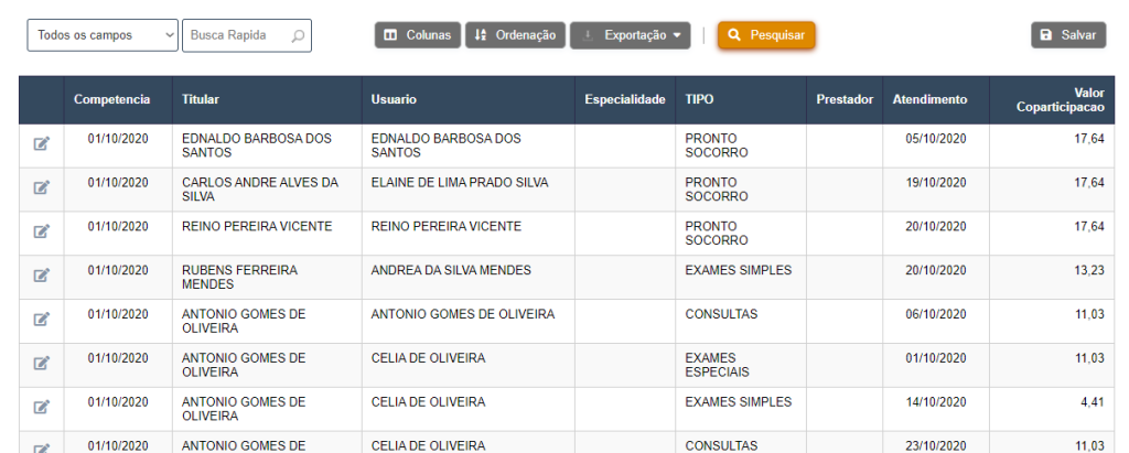 A tela inicial apresenta uma disposição intuitiva das funcionalidades: Acima da tabela, existe um campo de busca rápida acompanhado de um campo de seleção para especificar o que está sendo pesquisado, acompanhado dos seguintes botões: organização das colunas