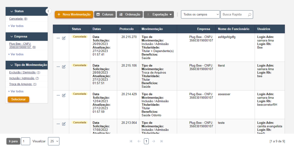 Status da Movimentação – Situação da movimentação em questão para acompanhamento pelo RH e pela equipe de operação.