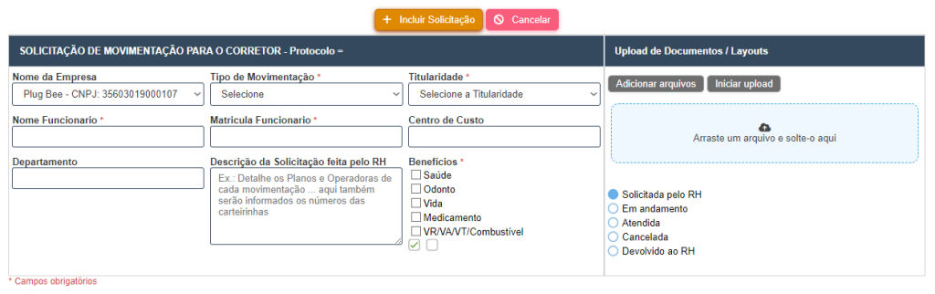 , o formulário acima carregará para o preenchimento das informações da movimentação, como também a possibilidade de envio de documentos. Essa tela possui 6 campos obrigatórios e 5 campos opcionais, sendo eles: