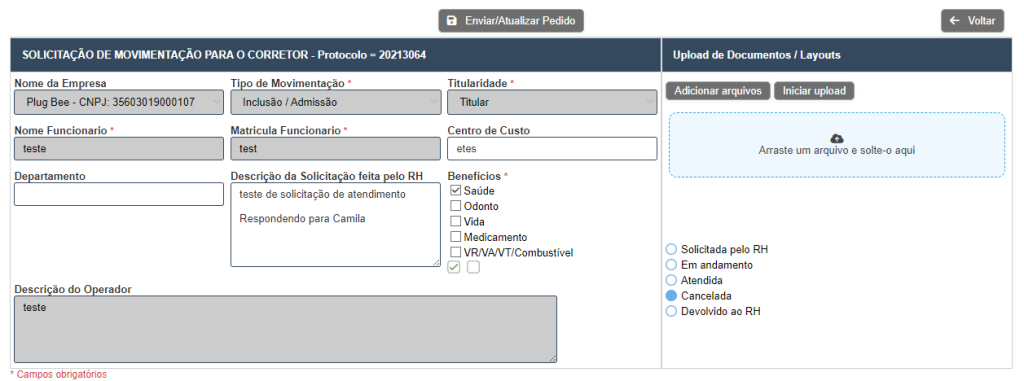 Esse setor tem como funcionalidade a solicitação e acompanhamento de movimentações cadastrais. A troca de informações e documentos é realizada de forma segura e em conformidade com a LGPD (Lei Geral de Proteção de Dados). Cada solicitação gera um número de protocolo que é a sua garantia de que a corretora fará o devido acompanhamento junto à operadora de benefícios, proporcionando com isso uma transparência no processo.