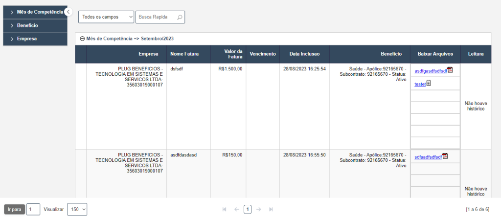 Esse setor tem como funcionalidade o acompanhamento dos faturamentos relacionados aos benefícios contratados. Contendo acesso aos documentos de cada faturamentos para baixar e subdivisões por mês de competência para uma melhor organização.